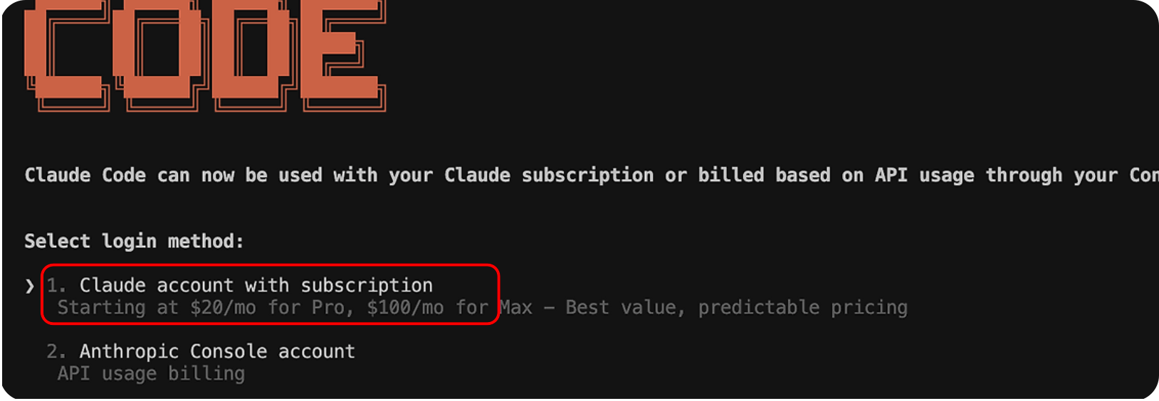 2. 다시 claude code 실행 후 /login으로 로그인 해주는데, 로그인 방식을 필히 아래 항목을 선택한다.